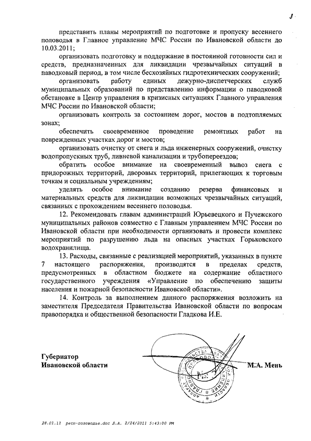 Распоряжение Правительства Ивановской области от 24.02.2011 N 42-рп "О подготовке к прохождению весеннего половодья на территории Ивановской области" (вместе с "Графиком проверок готовности органов местного самоуправления муниципальных образований Ивановской области и сил территориальной подсистемы единой государственной системы предупреждения и ликвидации чрезвычайных ситуаций к пропуску весеннего половодья")