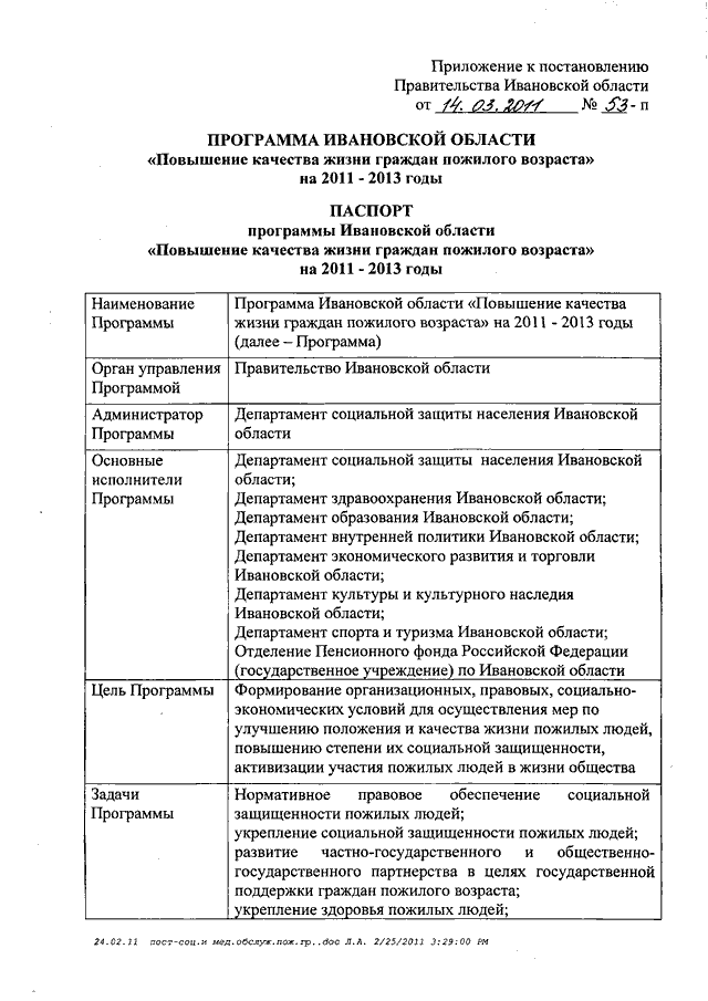 Постановление Правительства Ивановской области от 14.03.2011 N 53-п "О мерах по повышению качества социального и медицинского обслуживания пожилых людей" (вместе с "Программой Ивановской области "Повышение качества жизни граждан пожилого возраста" на 2011 - 2013 годы")