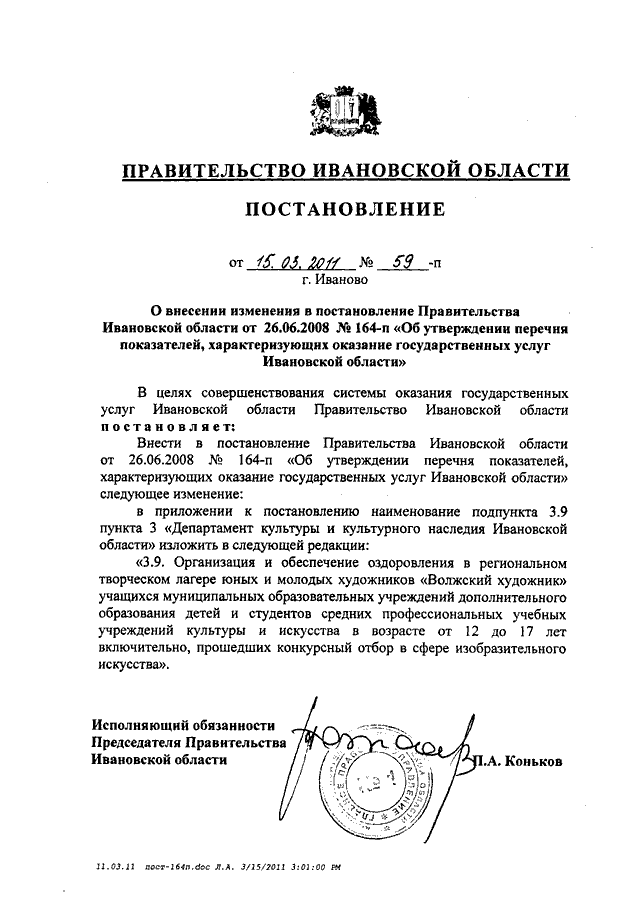 Постановление Правительства Ивановской области от 15.03.2011 N 59-п "О внесении изменения в постановление Правительства Ивановской области от 26.06.2008 N 164-п "Об утверждении перечня показателей, характеризующих оказание государственных услуг Ивановской области"