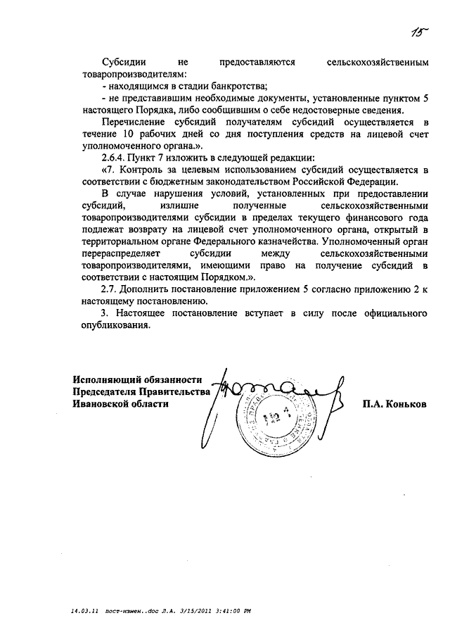 Постановление Правительства Ивановской области от 15.03.2011 N 63-п "О внесении изменений в некоторые постановления Правительства Ивановской области" (вместе с "Порядком предоставления субсидий на поддержку отдельных подотраслей растениеводства, источником финансового обеспечения которых является субсидия из федерального бюджета", "Порядком предоставления субсидий на компенсацию части затрат по страхованию урожая сельскохозяйственных культур, урожая многолетних насаждений и посадок многолетних насаждений, источником финансового обеспечения которых является субсидия из федерального бюджета")