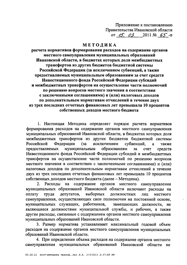 Постановление Правительства Ивановской области от 15.03.2011 N 65-п "Об утверждении методики расчета нормативов формирования расходов на содержание органов местного самоуправления муниципальных образований Ивановской области" (вместе с "Методикой расчета нормативов формирования расходов на содержание органов местного самоуправления муниципальных образований Ивановской области, в бюджетах которых доля межбюджетных трансфертов из других бюджетов бюджетной системы Российской Федерации (за исключением субвенций, а также предоставляемых муниципальным образованиям за счет средств Инвестиционного фонда Российской Федерации субсидий и межбюджетных трансфертов на осуществление части полномочий по решению вопросов местного значения в соответствии с заключенными соглашениями) и (или) налоговых доходов по дополнительным нормативам отчислений в течение двух из трех последних отчетных финансовых лет превышала 10 процентов собственных доходов местного бюджета")