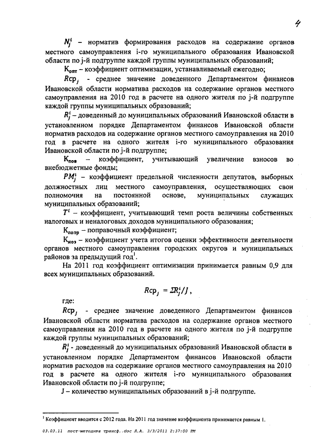 Постановление Правительства Ивановской области от 15.03.2011 N 65-п "Об утверждении методики расчета нормативов формирования расходов на содержание органов местного самоуправления муниципальных образований Ивановской области" (вместе с "Методикой расчета нормативов формирования расходов на содержание органов местного самоуправления муниципальных образований Ивановской области, в бюджетах которых доля межбюджетных трансфертов из других бюджетов бюджетной системы Российской Федерации (за исключением субвенций, а также предоставляемых муниципальным образованиям за счет средств Инвестиционного фонда Российской Федерации субсидий и межбюджетных трансфертов на осуществление части полномочий по решению вопросов местного значения в соответствии с заключенными соглашениями) и (или) налоговых доходов по дополнительным нормативам отчислений в течение двух из трех последних отчетных финансовых лет превышала 10 процентов собственных доходов местного бюджета")