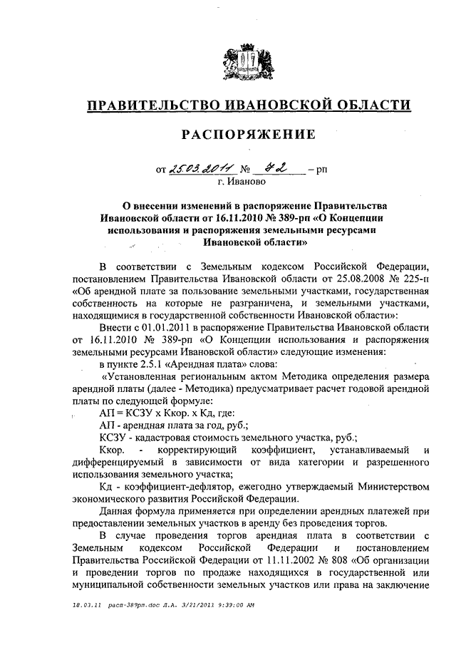 Распоряжение Правительства Ивановской области от 25.03.2011 N 72-рп "О внесении изменений в распоряжение Правительства Ивановской области от 16.11.2010 N 389-рп "О Концепции использования и распоряжения земельными ресурсами Ивановской области"