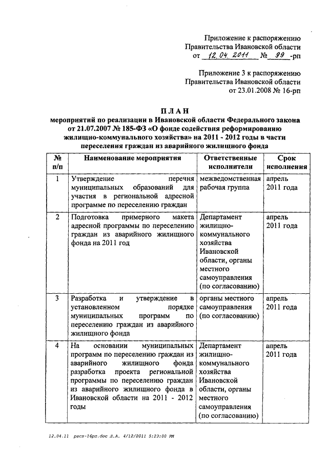 Распоряжение Правительства Ивановской области от 12.04.2011 N 99-рп "О внесении изменений в распоряжение Правительства Ивановской области от 23.01.2008 N 16-рп "О мерах по реализации в Ивановской области Федерального закона от 21.07.2007 N 185-ФЗ "О фонде содействия реформированию жилищно-коммунального хозяйства" (вместе с "Планом мероприятий по реализации в Ивановской области Федерального закона от 21.07.2007 N 185-ФЗ "О фонде содействия реформированию жилищно-коммунального хозяйства" на 2011 - 2012 годы в части переселения граждан из аварийного жилищного фонда")