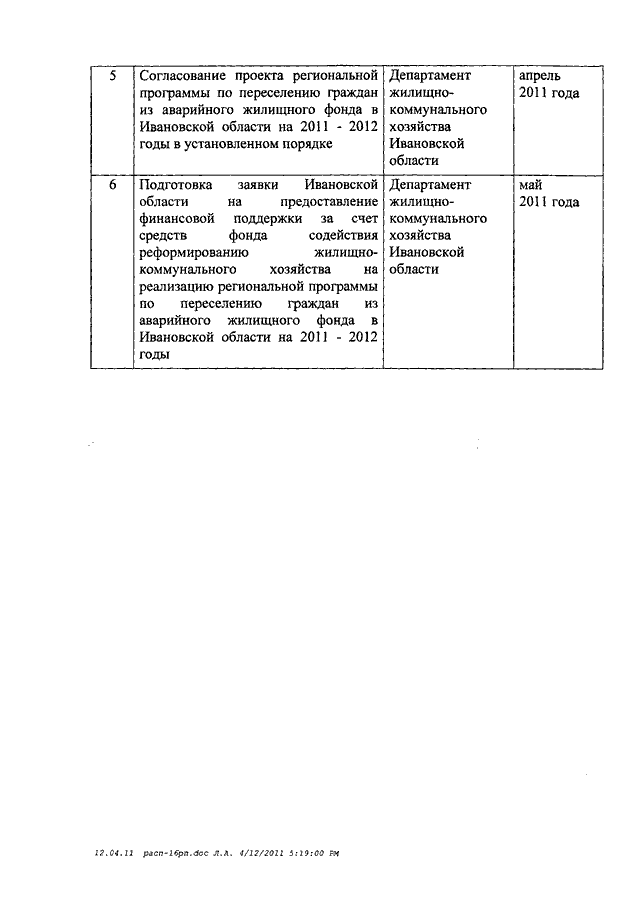 Распоряжение Правительства Ивановской области от 12.04.2011 N 99-рп "О внесении изменений в распоряжение Правительства Ивановской области от 23.01.2008 N 16-рп "О мерах по реализации в Ивановской области Федерального закона от 21.07.2007 N 185-ФЗ "О фонде содействия реформированию жилищно-коммунального хозяйства" (вместе с "Планом мероприятий по реализации в Ивановской области Федерального закона от 21.07.2007 N 185-ФЗ "О фонде содействия реформированию жилищно-коммунального хозяйства" на 2011 - 2012 годы в части переселения граждан из аварийного жилищного фонда")