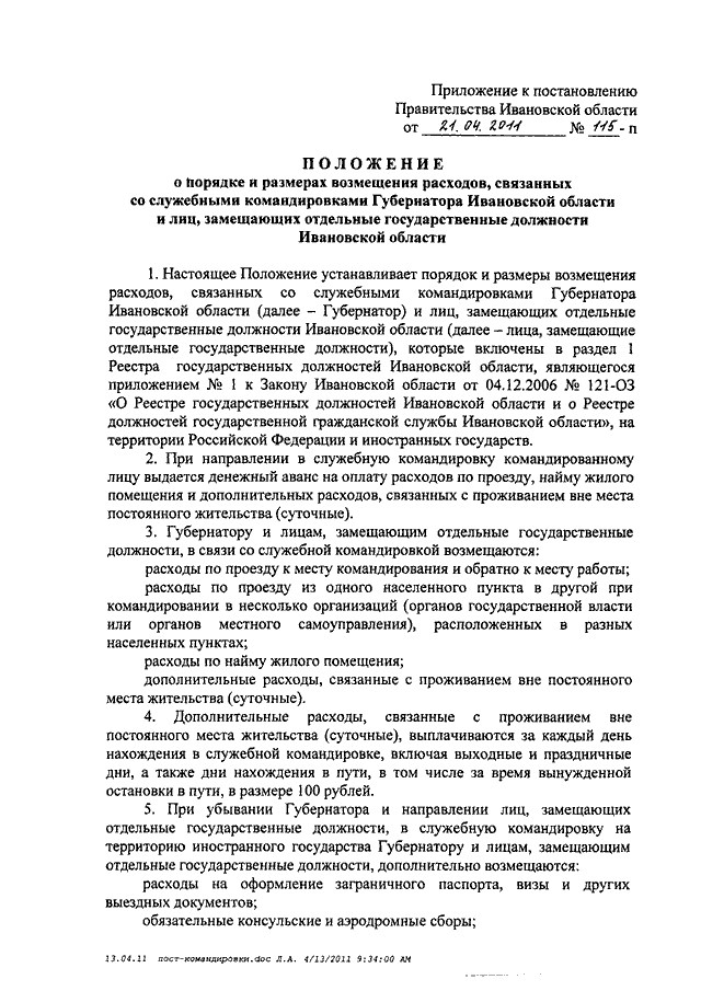 Постановление Правительства Ивановской области от 21.04.2011 N 115-п "О порядке и размерах возмещения расходов, связанных со служебными командировками Губернатора Ивановской области и лиц, замещающих отдельные государственные должности Ивановской области" (вместе с "Положением о порядке и размерах возмещения расходов, связанных со служебными командировками Губернатора Ивановской области и лиц, замещающих отдельные государственные должности Ивановской области")