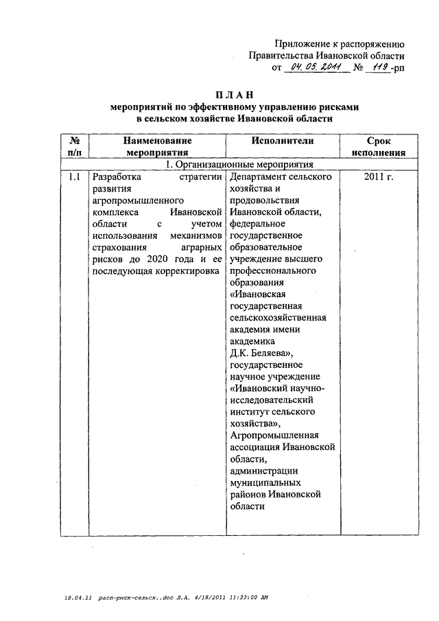 Распоряжение Правительства Ивановской области от 04.05.2011 N 119-рп "О комплексе мероприятий по эффективному управлению рисками в сельском хозяйстве региона" (вместе с "Планом мероприятий по эффективному управлению рисками в сельском хозяйстве Ивановской области")