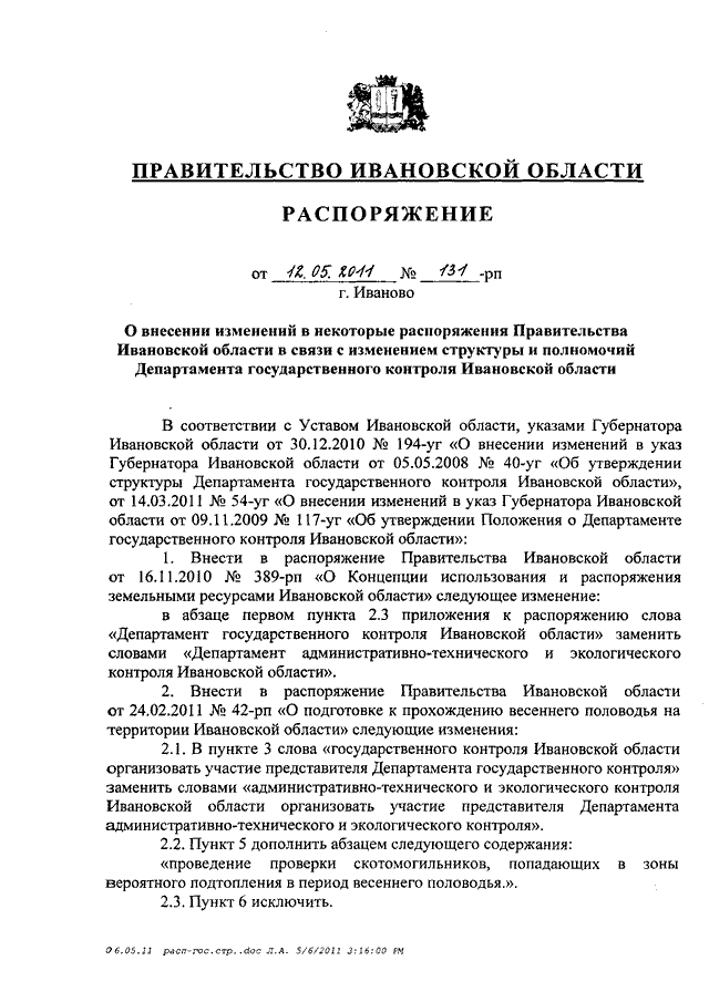 Распоряжение Правительства Ивановской области от 12.05.2011 N 131-рп "О внесении изменений в некоторые распоряжения Правительства Ивановской области в связи с изменением структуры и полномочий Департамента государственного контроля Ивановской области"