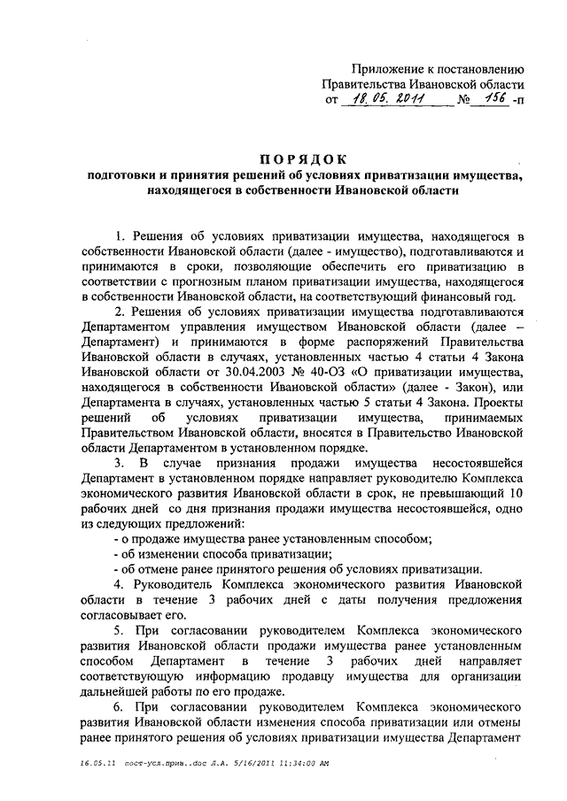 Постановление Правительства Ивановской области от 18.05.2011 N 156-п "Об утверждении Порядка подготовки и принятия решений об условиях приватизации имущества, находящегося в собственности Ивановской области"