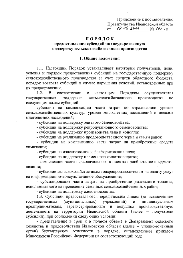 Постановление Правительства Ивановской области от 19.05.2011 N 165-п "Об утверждении Порядка предоставления субсидий на государственную поддержку сельскохозяйственного производства"