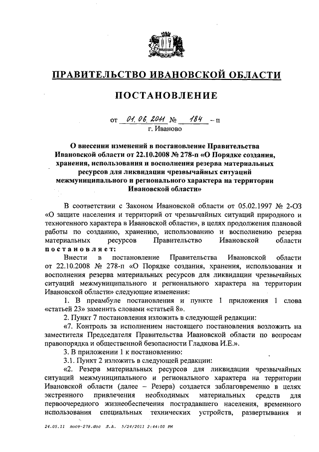 Постановление Правительства Ивановской области от 01.06.2011 N 184-п "О внесении изменений в постановление Правительства Ивановской области от 22.10.2008 N 278-п "О Порядке создания, хранения, использования и восполнения резерва материальных ресурсов для ликвидации чрезвычайных ситуаций межмуниципального и регионального характера на территории Ивановской области" (вместе с "Номенклатурой и объемами накопления резерва материальных ресурсов для ликвидации чрезвычайных ситуаций межмуниципального и регионального характера на территории Ивановской области")