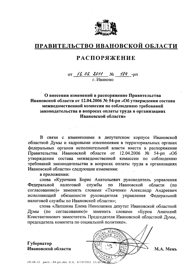Распоряжение Правительства Ивановской области от 16.06.2011 N 184-рп "О внесении изменений в распоряжение Правительства Ивановской области от 12.04.2006 N 54-рп "Об утверждении состава межведомственной комиссии по соблюдению требований законодательства в вопросах оплаты труда в организациях Ивановской области"