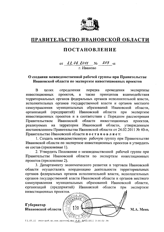 Постановление Правительства Ивановской области от 22.06.2011 N 207-п "О создании межведомственной рабочей группы при Правительстве Ивановской области по экспертизе инвестиционных проектов" (вместе с "Положением о межведомственной рабочей группе при Правительстве Ивановской области по экспертизе инвестиционных проектов")