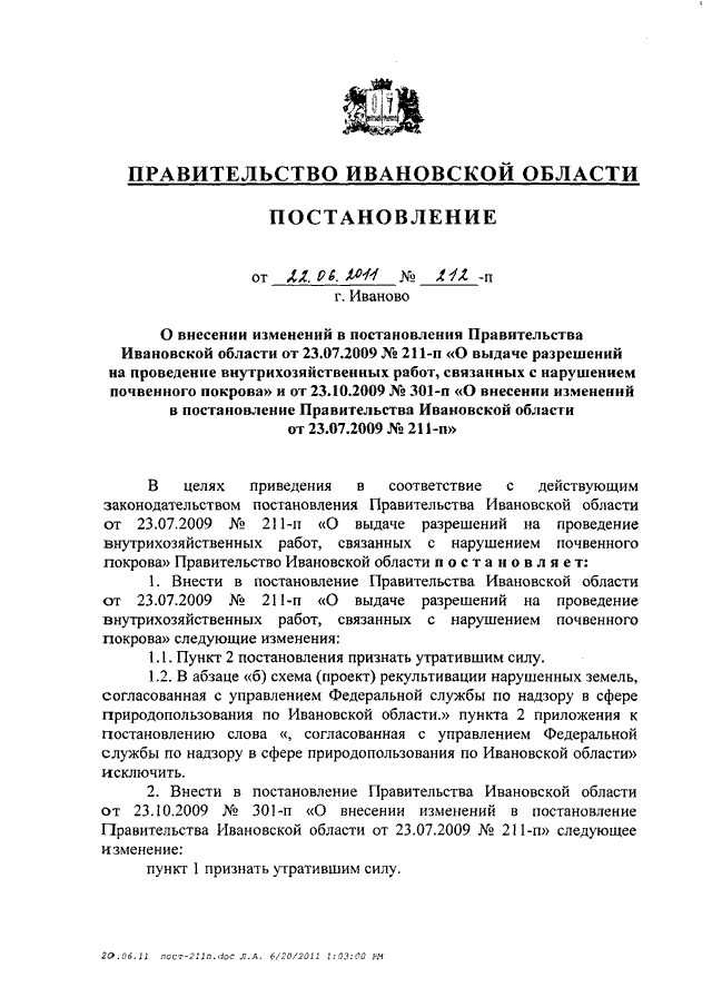 Постановление Правительства Ивановской области от 22.06.2011 N 212-п "О внесении изменений в постановления Правительства Ивановской области от 23.07.2009 N 211-п "О выдаче разрешений на проведение внутрихозяйственных работ, связанных с нарушением почвенного покрова" и от 23.10.2009 N 301-п "О внесении изменений в постановление Правительства Ивановской области от 23.07.2009 N 211-п"
