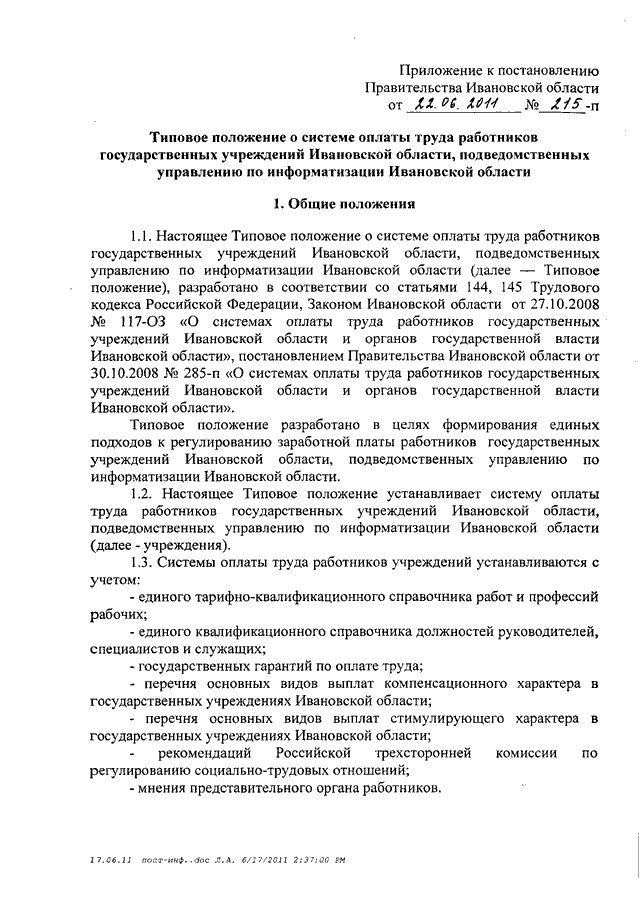Постановление Правительства Ивановской области от 22.06.2011 N 215-п "О системе оплаты труда работников государственных учреждений Ивановской области, подведомственных управлению по информатизации Ивановской области" (вместе с "Типовым положением о системе оплаты труда работников государственных учреждений Ивановской области, подведомственных управлению по информатизации Ивановской области")