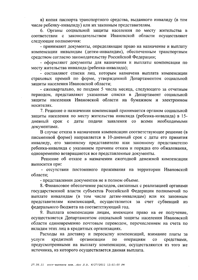Постановление Правительства Ивановской области от 29.06.2011 N 231-п "Об утверждении Правил выплаты инвалидам (в том числе детям-инвалидам), имеющим транспортные средства в соответствии с медицинскими показаниями, или их законным представителям компенсации уплаченной ими страховой премии по договору обязательного страхования гражданской ответственности владельцев транспортных средств, а также расходования и учета средств, поступающих из Федерального фонда компенсаций на реализацию Ивановской областью полномочий на указанные цели"