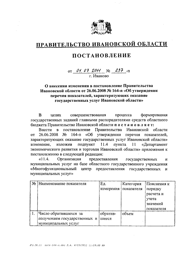 Постановление Правительства Ивановской области от 01.07.2011 N 237-п "О внесении изменения в постановление Правительства Ивановской области от 26.06.2008 N 164-п "Об утверждении перечня показателей, характеризующих оказание государственных услуг Ивановской области"