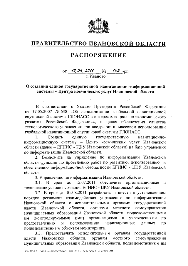 Распоряжение Правительства Ивановской области от 19.05.2011 N 153-рп "О создании единой государственной навигационно-информационной системы - Центра космических услуг Ивановской области"