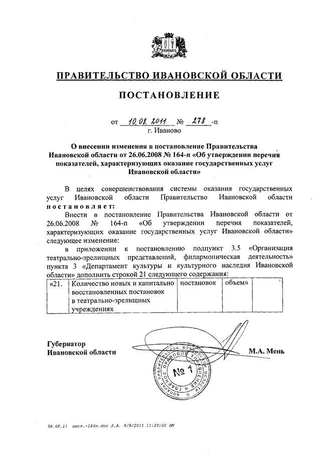 Постановление Правительства Ивановской области от 10.08.2011 N 278-п "О внесении изменения в постановление Правительства Ивановской области от 26.06.2008 N 164-п "Об утверждении перечня показателей, характеризующих оказание государственных услуг Ивановской области"