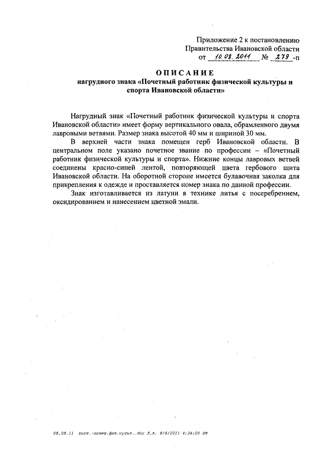 Постановление Правительства Ивановской области от 10.08.2011 N 279-п "Об учреждении звания "Почетный работник физической культуры и спорта Ивановской области" (вместе с "Положением о звании "Почетный работник физической культуры и спорта Ивановской области")