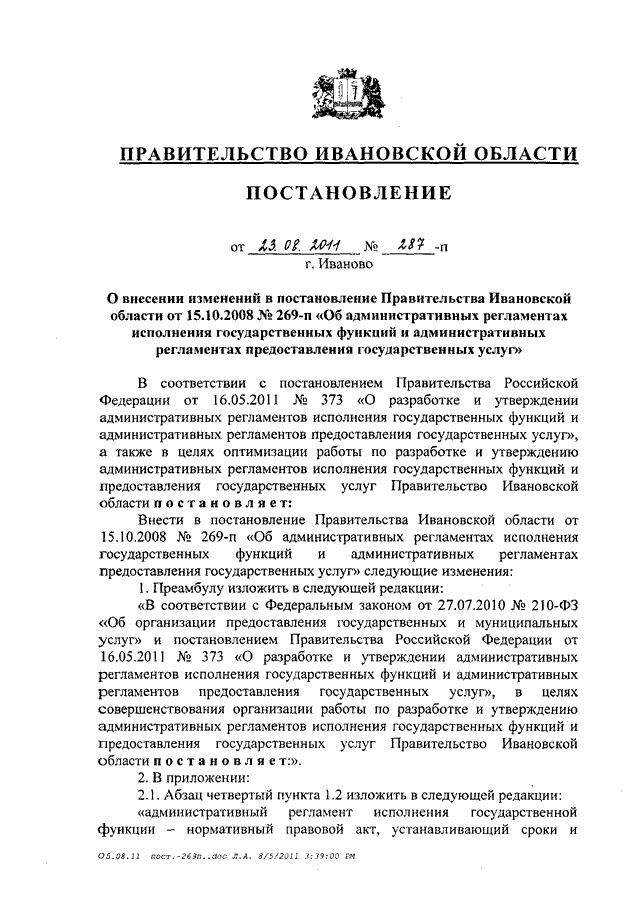 Постановление Правительства Ивановской области от 23.08.2011 N 287-п "О внесении изменений в постановление Правительства Ивановской области от 15.10.2008 N 269-п "Об административных регламентах исполнения государственных функций и административных регламентах предоставления государственных услуг"