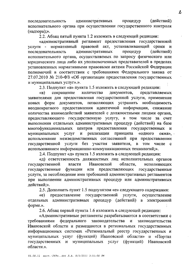 Постановление Правительства Ивановской области от 23.08.2011 N 287-п "О внесении изменений в постановление Правительства Ивановской области от 15.10.2008 N 269-п "Об административных регламентах исполнения государственных функций и административных регламентах предоставления государственных услуг"