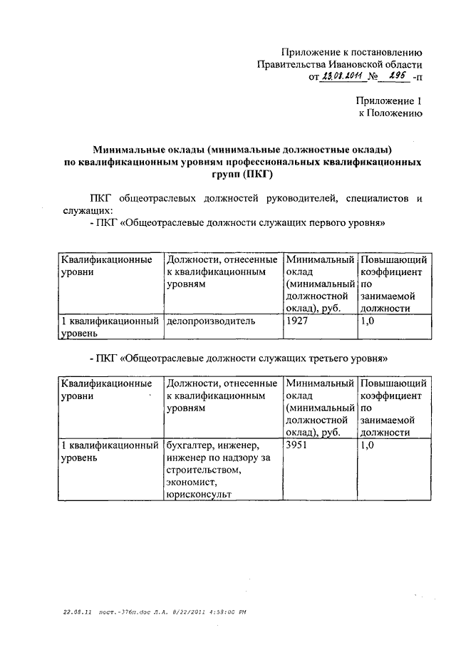 Постановление Правительства Ивановской области от 23.08.2011 N 295-п "О внесении изменений в постановление Правительства Ивановской области от 31.12.2008 N 376-п "О системе оплаты труда работников областного государственного учреждения "Агентство капитального строительства Ивановской области"