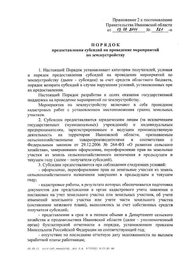 Постановление Правительства Ивановской области от 13.09.2011 N 321-п "Об утверждении порядков предоставления субсидий на проведение мероприятий по вовлечению в оборот залежных земель и проведение мероприятий по землеустройству"