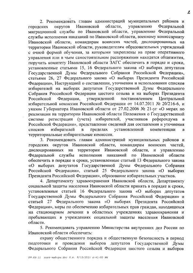 Постановление Правительства Ивановской области от 13.09.2011 N 325-п "О мерах по оказанию содействия избирательным комиссиям в реализации их полномочий при подготовке и проведении выборов депутатов Государственной Думы Федерального Собрания Российской Федерации шестого созыва и выборов Президента Российской Федерации"