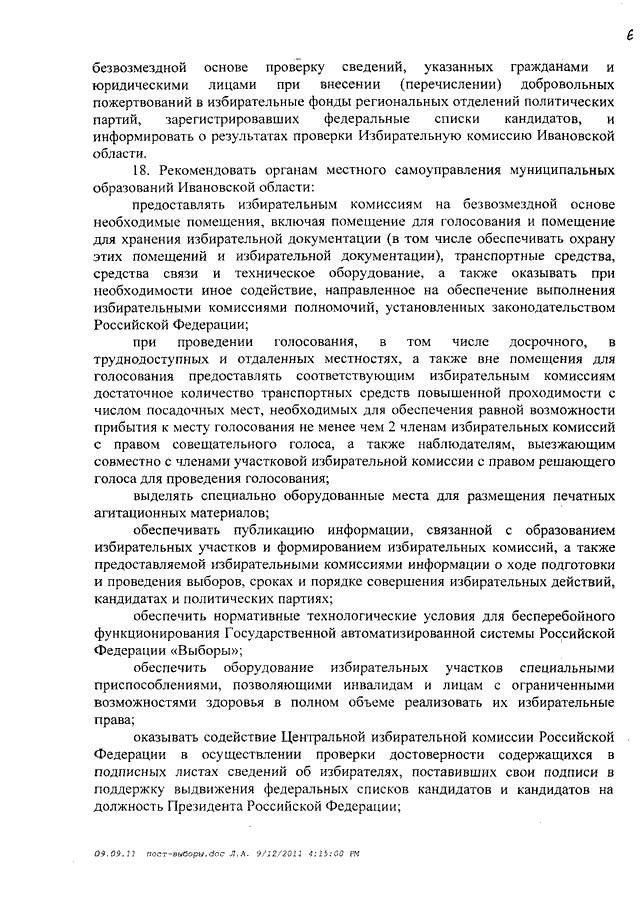 Постановление Правительства Ивановской области от 13.09.2011 N 325-п "О мерах по оказанию содействия избирательным комиссиям в реализации их полномочий при подготовке и проведении выборов депутатов Государственной Думы Федерального Собрания Российской Федерации шестого созыва и выборов Президента Российской Федерации"