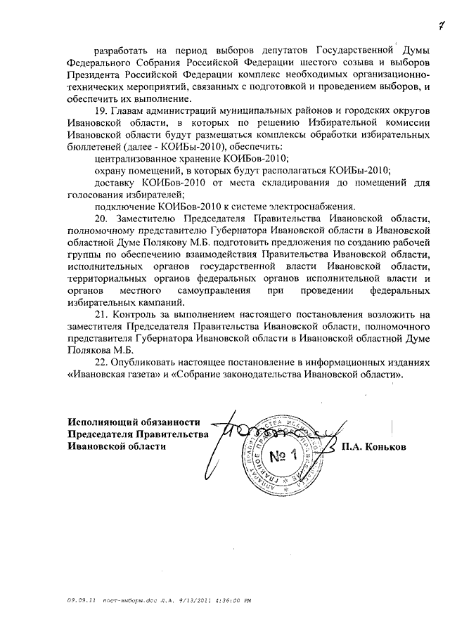 Постановление Правительства Ивановской области от 13.09.2011 N 325-п "О мерах по оказанию содействия избирательным комиссиям в реализации их полномочий при подготовке и проведении выборов депутатов Государственной Думы Федерального Собрания Российской Федерации шестого созыва и выборов Президента Российской Федерации"