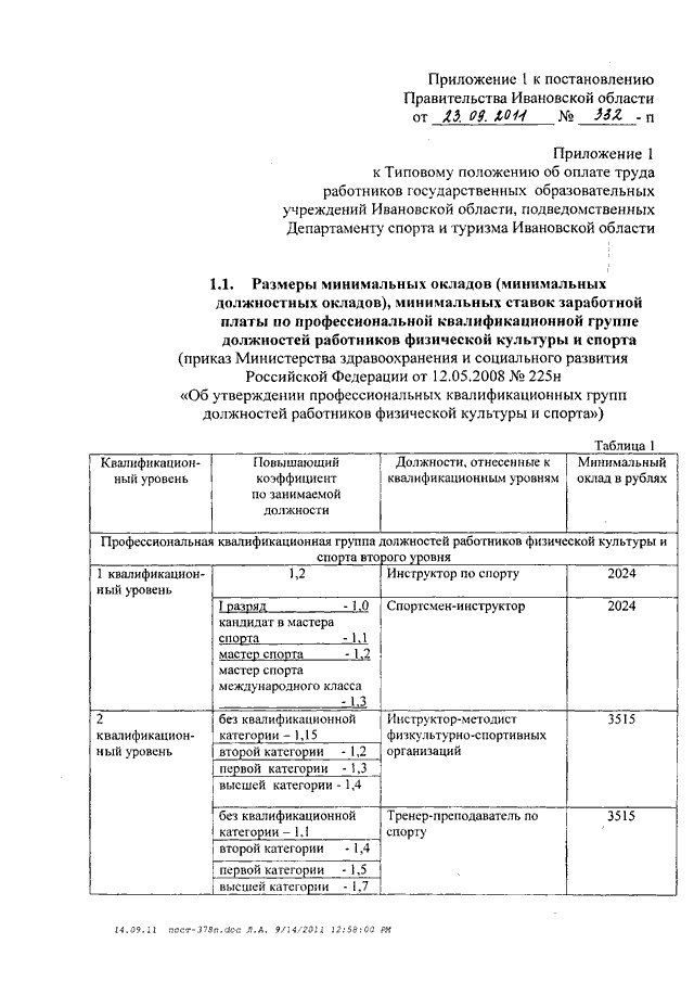 Постановление Правительства Ивановской области от 23.09.2011 N 332-п "О внесении изменений в постановление Правительства Ивановской области от 31.12.2008 N 378-п "О системе оплаты труда работников государственных образовательных учреждений Ивановской области, подведомственных комитету Ивановской области по спорту" (вместе с "Нормативом оплаты труда тренеров-преподавателей по спорту за подготовку одного занимающегося (в % от ставки заработной платы) на этапах спортивной подготовки")