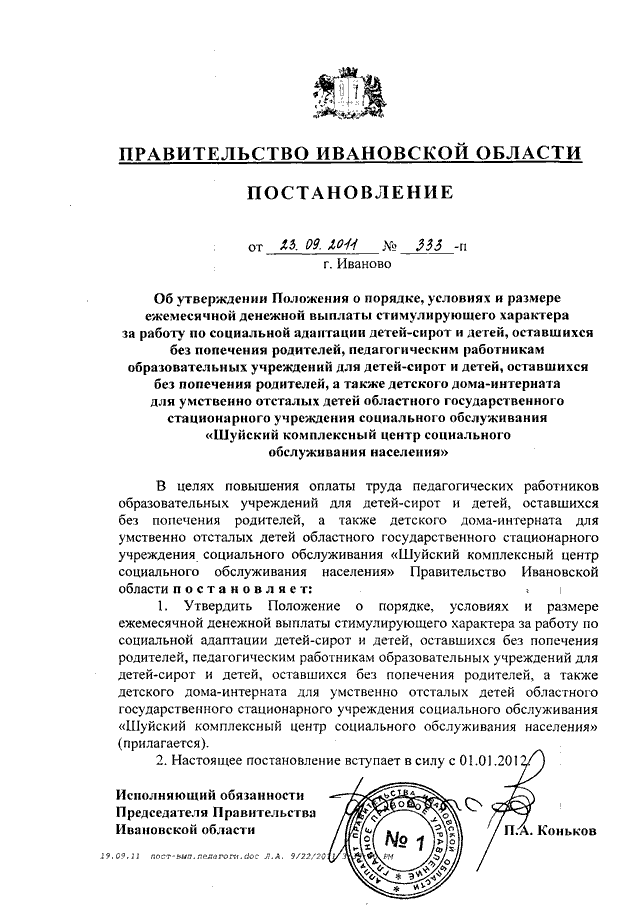 Постановление Правительства Ивановской области от 23.09.2011 N 333-п "Об утверждении Положения о порядке, условиях и размере ежемесячной денежной выплаты стимулирующего характера за работу по социальной адаптации детей-сирот и детей, оставшихся без попечения родителей, педагогическим работникам образовательных учреждений для детей-сирот и детей, оставшихся без попечения родителей, а также детского дома-интерната для умственно отсталых детей областного государственного стационарного учреждения социального обслуживания "Шуйский комплексный центр социального обслуживания населения"