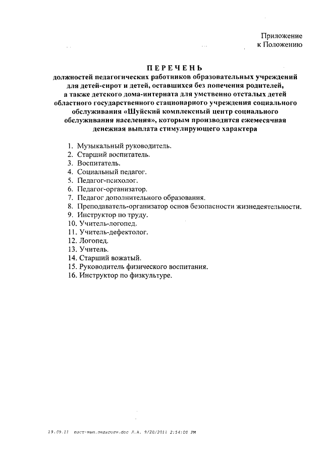 Постановление Правительства Ивановской области от 23.09.2011 N 333-п "Об утверждении Положения о порядке, условиях и размере ежемесячной денежной выплаты стимулирующего характера за работу по социальной адаптации детей-сирот и детей, оставшихся без попечения родителей, педагогическим работникам образовательных учреждений для детей-сирот и детей, оставшихся без попечения родителей, а также детского дома-интерната для умственно отсталых детей областного государственного стационарного учреждения социального обслуживания "Шуйский комплексный центр социального обслуживания населения"
