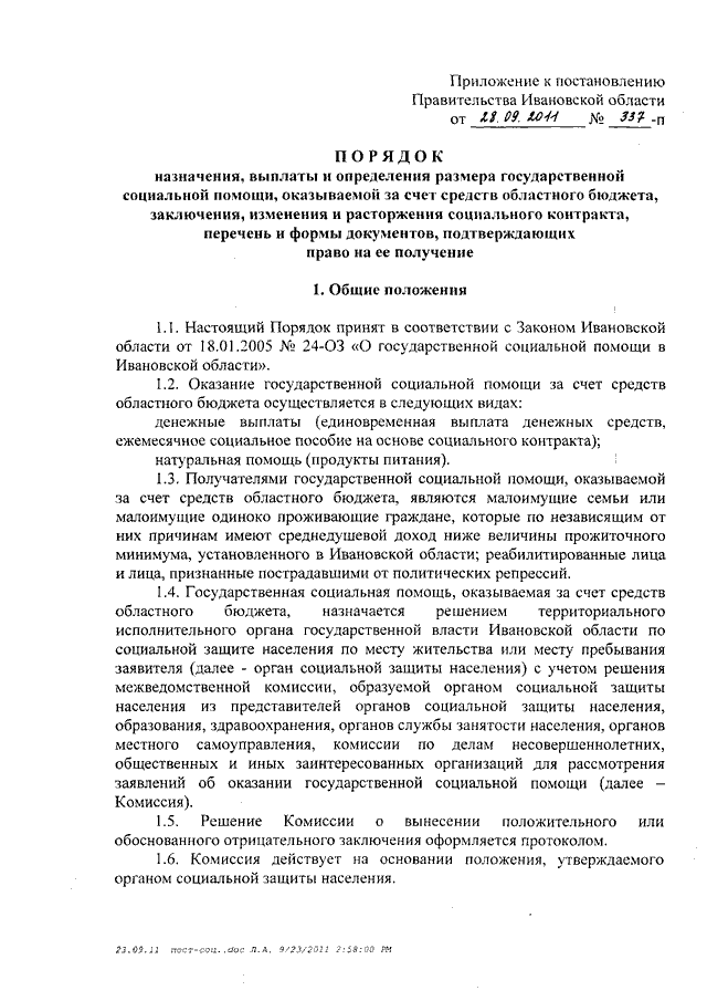 Постановление Правительства Ивановской области от 28.09.2011 N 337-п "Об утверждении Порядка назначения, выплаты и определения размера государственной социальной помощи, оказываемой за счет средств областного бюджета, заключения, изменения и расторжения социального контракта, перечня и форм документов, подтверждающих право на ее получение"