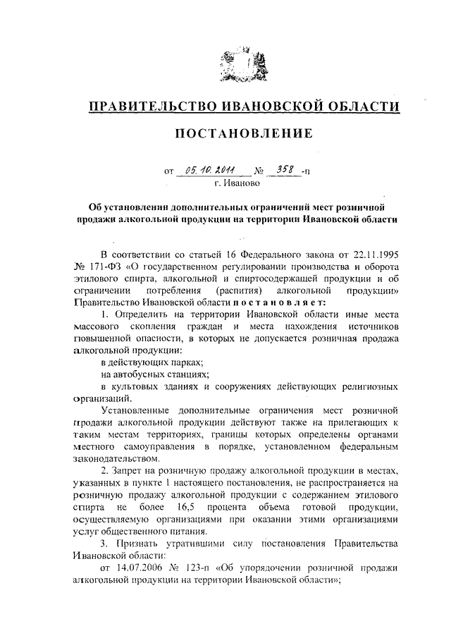 Постановление Правительства Ивановской области от 05.10.2011 N 358-п "Об установлении дополнительных ограничений мест розничной продажи алкогольной продукции на территории Ивановской области"