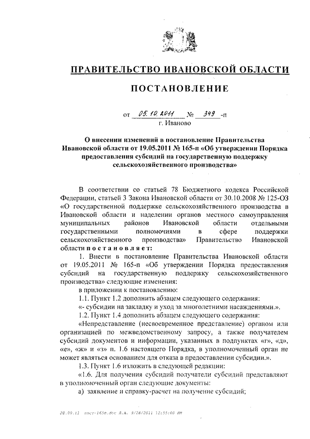 Постановление Правительства Ивановской области от 05.10.2011 N 349-п "О внесении изменений в постановление Правительства Ивановской области от 19.05.2011 N 165-п "Об утверждении Порядка предоставления субсидий на государственную поддержку сельскохозяйственного производства"