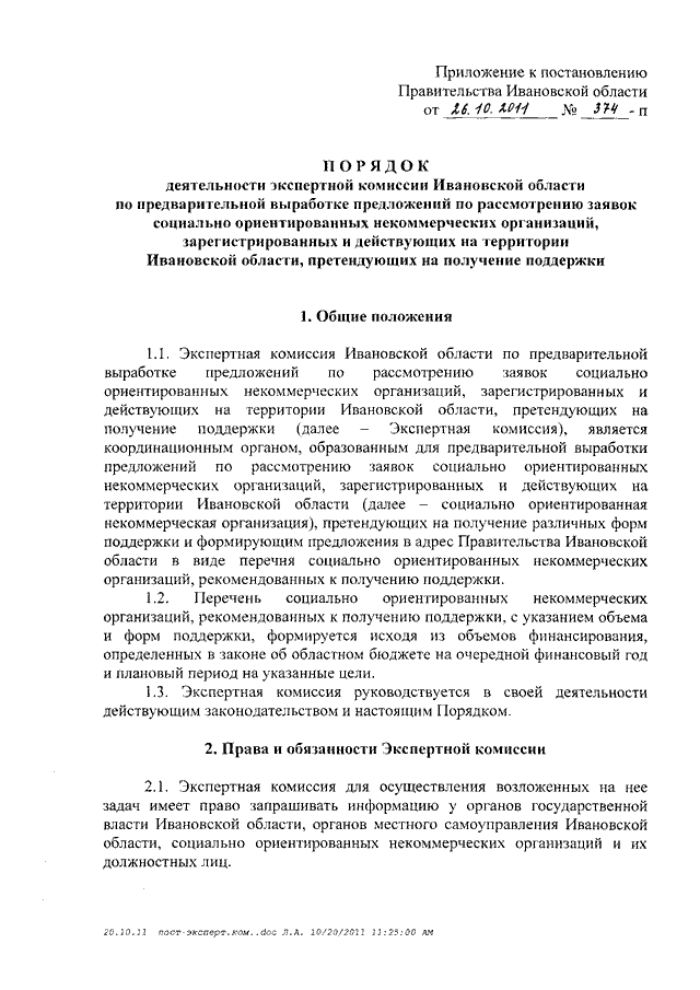 Постановление Правительства Ивановской области от 26.10.2011 N 374-п "О Порядке деятельности экспертной комиссии Ивановской области по предварительной выработке предложений по рассмотрению заявок социально ориентированных некоммерческих организаций, зарегистрированных и действующих на территории Ивановской области, претендующих на получение поддержки"