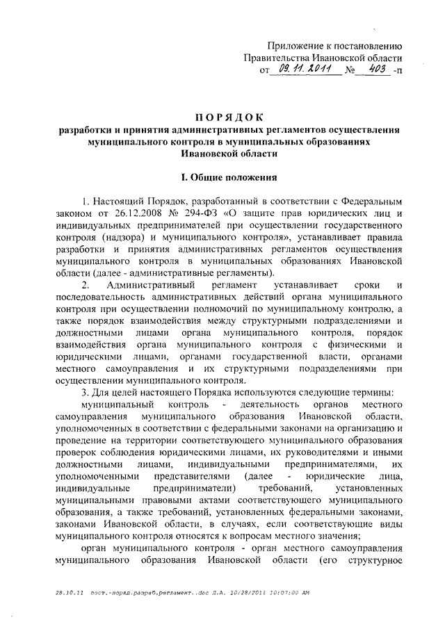 Постановление Правительства Ивановской области от 09.11.2011 N 403-п "Об утверждении Порядка разработки и принятия административных регламентов осуществления муниципального контроля в муниципальных образованиях Ивановской области"