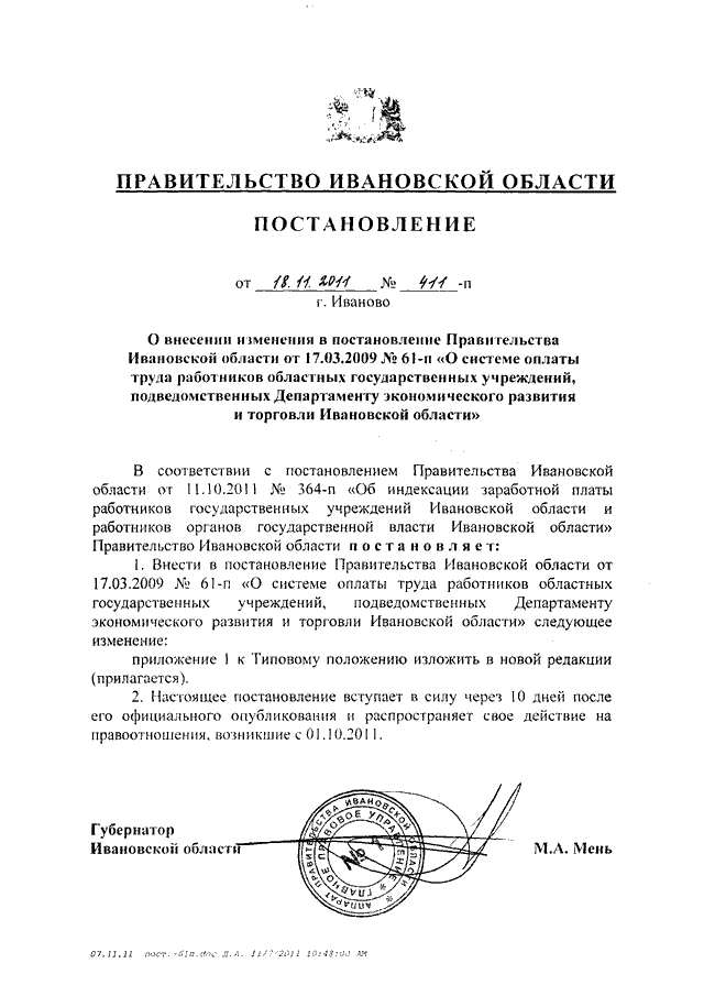 Постановление Правительства Ивановской области от 18.11.2011 N 411-п "О внесении изменения в постановление Правительства Ивановской области от 17.03.2009 N 61-п "О системе оплаты труда работников областных государственных учреждений, подведомственных Департаменту экономического развития и торговли Ивановской области" (вместе с "Перечнем профессиональных квалификационных групп должностей работников областных государственных учреждений, подведомственных Департаменту экономического развития и торговли Ивановской области")