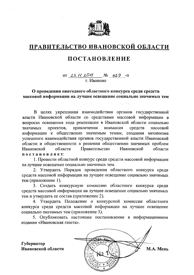Постановление Правительства Ивановской области от 23.11.2011 N 429-п "О проведении ежегодного областного конкурса среди средств массовой информации на лучшее освещение социально значимых тем" (вместе с "Порядком проведения областного конкурса среди средств массовой информации на лучшее освещение социально значимых тем", "Положением о конкурсной комиссии областного конкурса среди средств массовой информации на лучшее освещение социально значимых тем")