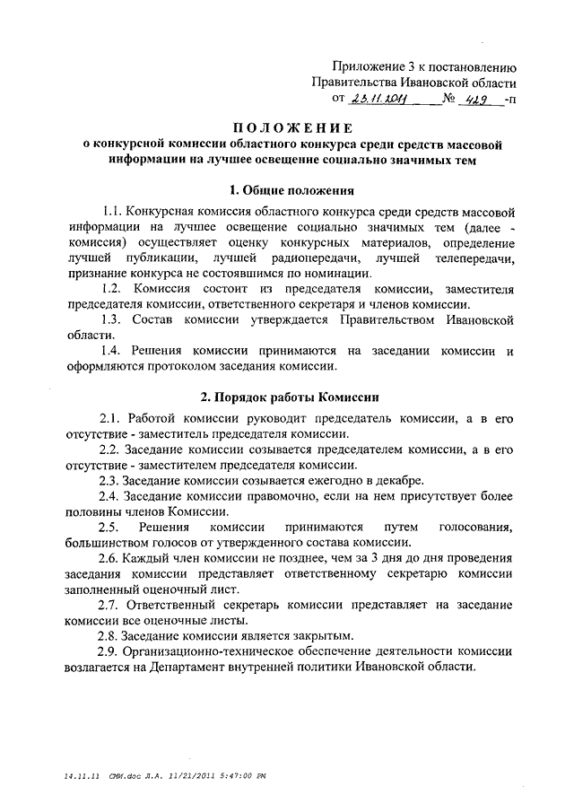 Постановление Правительства Ивановской области от 23.11.2011 N 429-п "О проведении ежегодного областного конкурса среди средств массовой информации на лучшее освещение социально значимых тем" (вместе с "Порядком проведения областного конкурса среди средств массовой информации на лучшее освещение социально значимых тем", "Положением о конкурсной комиссии областного конкурса среди средств массовой информации на лучшее освещение социально значимых тем")