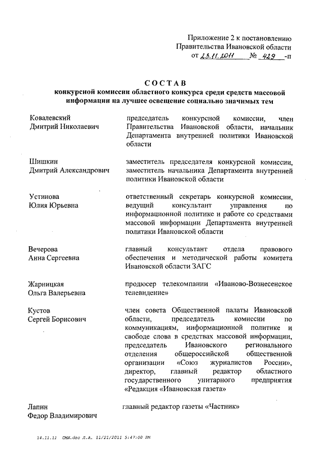 Постановление Правительства Ивановской области от 23.11.2011 N 429-п "О проведении ежегодного областного конкурса среди средств массовой информации на лучшее освещение социально значимых тем" (вместе с "Порядком проведения областного конкурса среди средств массовой информации на лучшее освещение социально значимых тем", "Положением о конкурсной комиссии областного конкурса среди средств массовой информации на лучшее освещение социально значимых тем")