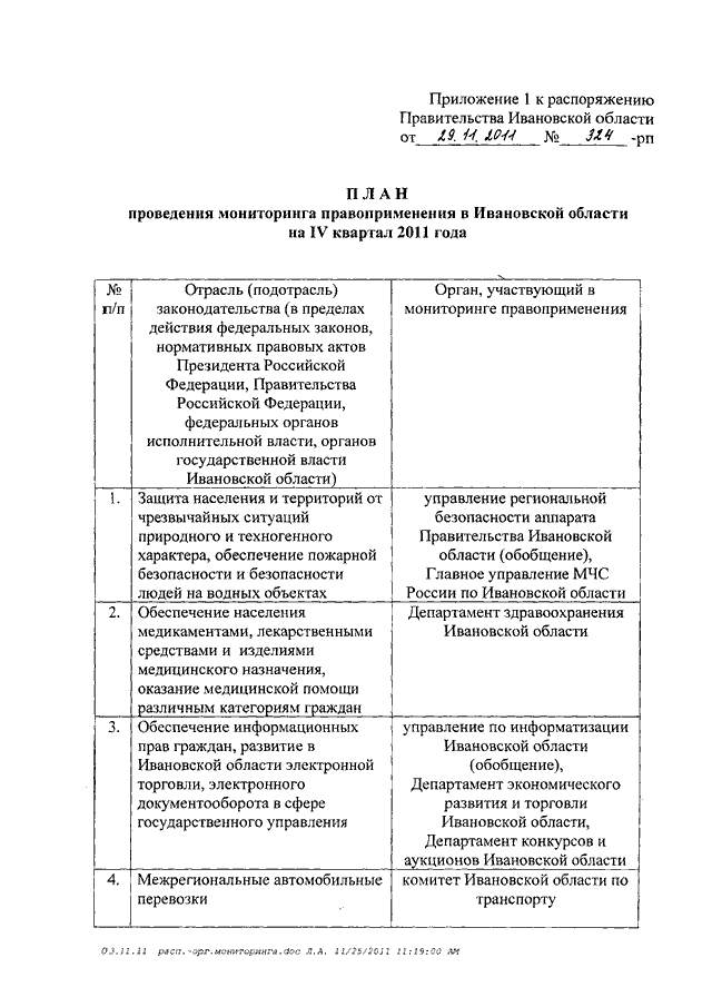 Распоряжение Правительства Ивановской области от 29.11.2011 N 324-рп "Об организации мониторинга правоприменения в Ивановской области" (вместе с "Планом проведения мониторинга правоприменения в Ивановской области на IV квартал 2011 года", "Планом проведения мониторинга правоприменения в Ивановской области на 2012 год")