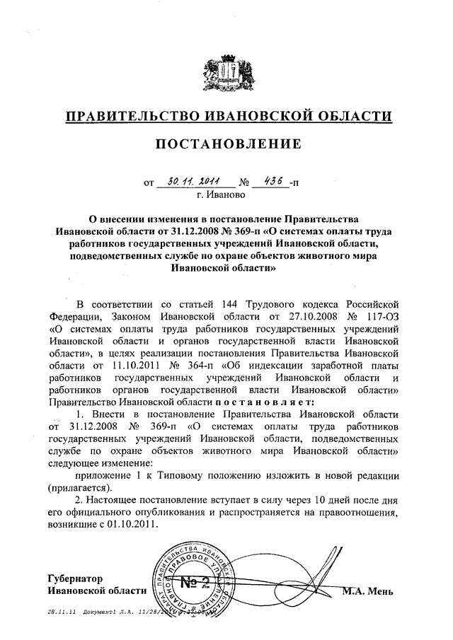 Постановление Правительства Ивановской области от 30.11.2011 N 436-п "О внесении изменения в постановление Правительства Ивановской области от 31.12.2008 N 369-п "О системах оплаты труда работников государственных учреждений Ивановской области, подведомственных службе по охране объектов животного мира Ивановской области"