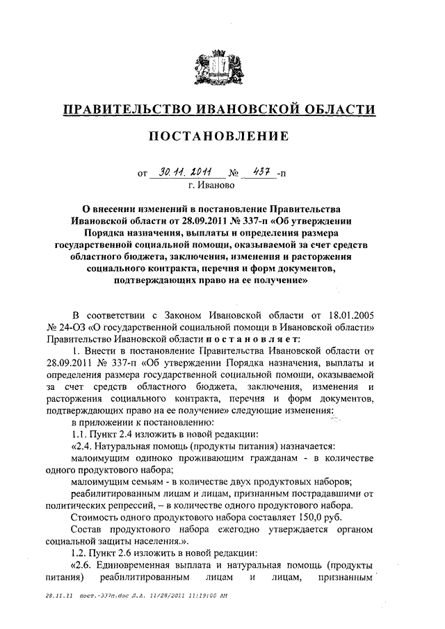 Постановление Правительства Ивановской области от 30.11.2011 N 437-п "О внесении изменений в постановление Правительства Ивановской области от 28.09.2011 N 337-п "Об утверждении Порядка назначения, выплаты и определения размера государственной социальной помощи, оказываемой за счет средств областного бюджета, заключения, изменения и расторжения социального контракта, перечня и форм документов, подтверждающих право на ее получение"