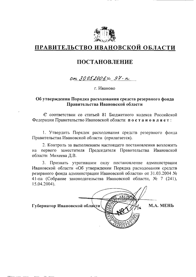 Постановление Правительства Ивановской области от 30.05.2006 N 97-п "Об утверждении Порядка расходования средств резервного фонда Правительства Ивановской области"