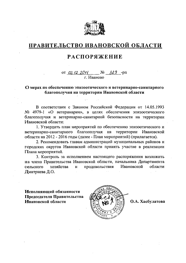 Распоряжение Правительства Ивановской области от 02.12.2011 N 329-рп "О мерах по обеспечению эпизоотического и ветеринарно-санитарного благополучия на территории Ивановской области" (вместе с "Планом мероприятий по обеспечению эпизоотического и ветеринарно-санитарного благополучия на территории Ивановской области на 2012 - 2016 годы")