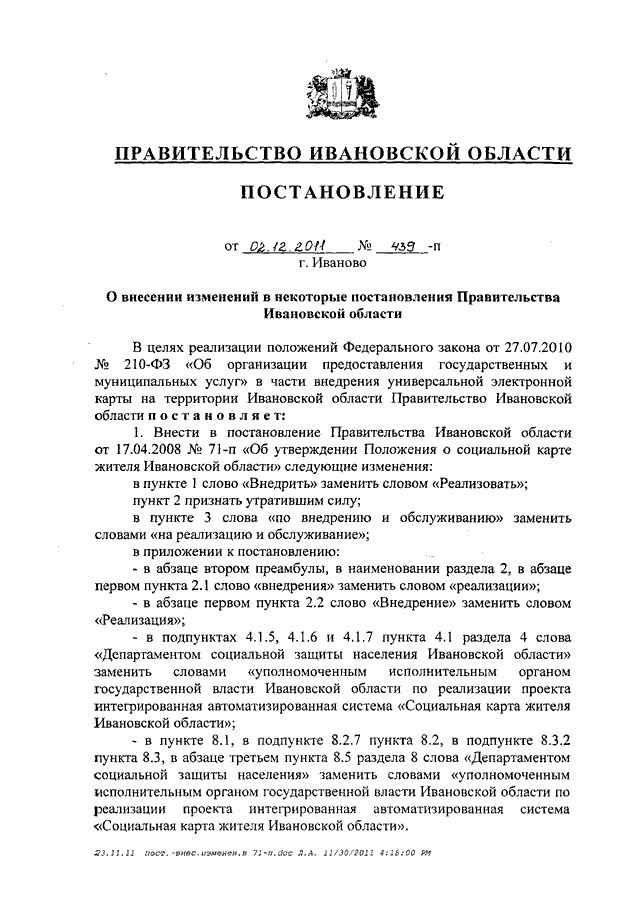 Постановление Правительства Ивановской области от 02.12.2011 N 439-п "О внесении изменений в некоторые постановления Правительства Ивановской области"