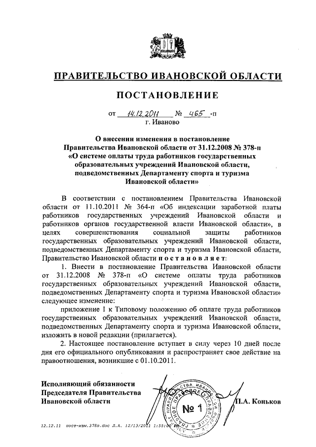 Постановление Правительства Ивановской области от 14.12.2011 N 465-п "О внесении изменения в постановление Правительства Ивановской области от 31.12.2008 N 378-п "О системе оплаты труда работников государственных образовательных учреждений Ивановской области, подведомственных Департаменту спорта и туризма Ивановской области"